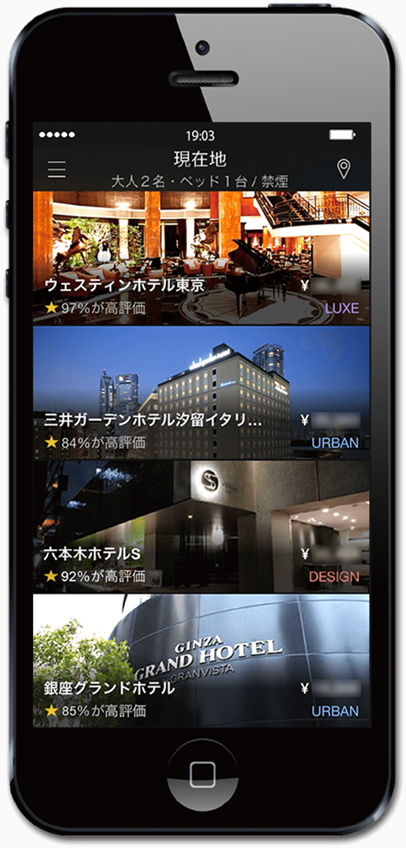 いつもよりワンランク上のホテルを直前でお得に予約!現在地から近いホテルを一覧に表示しスマートフォンから最短10秒で簡単に予約できます。